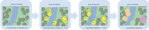 - Obtaining GBIF observations: The user specifies a species of interest, an area of interest, and a time period. The tool then retrieves the corresponding species occurrence records from the Global Biodiversity Information Facility (GBIF).