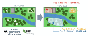 2. Habitat change over time. These inputs are maps describing temporal changes in suitable habitat for the species. They are derived from Earth Observation datasets, such as the European Space Agency’s global land cover maps or tree cover data from the Global Forest Watch. By quantifying changes in habitat area for each population over time, the tool estimates potential changes in population size and calculates the Ne500 and PM indicators accordingly.
